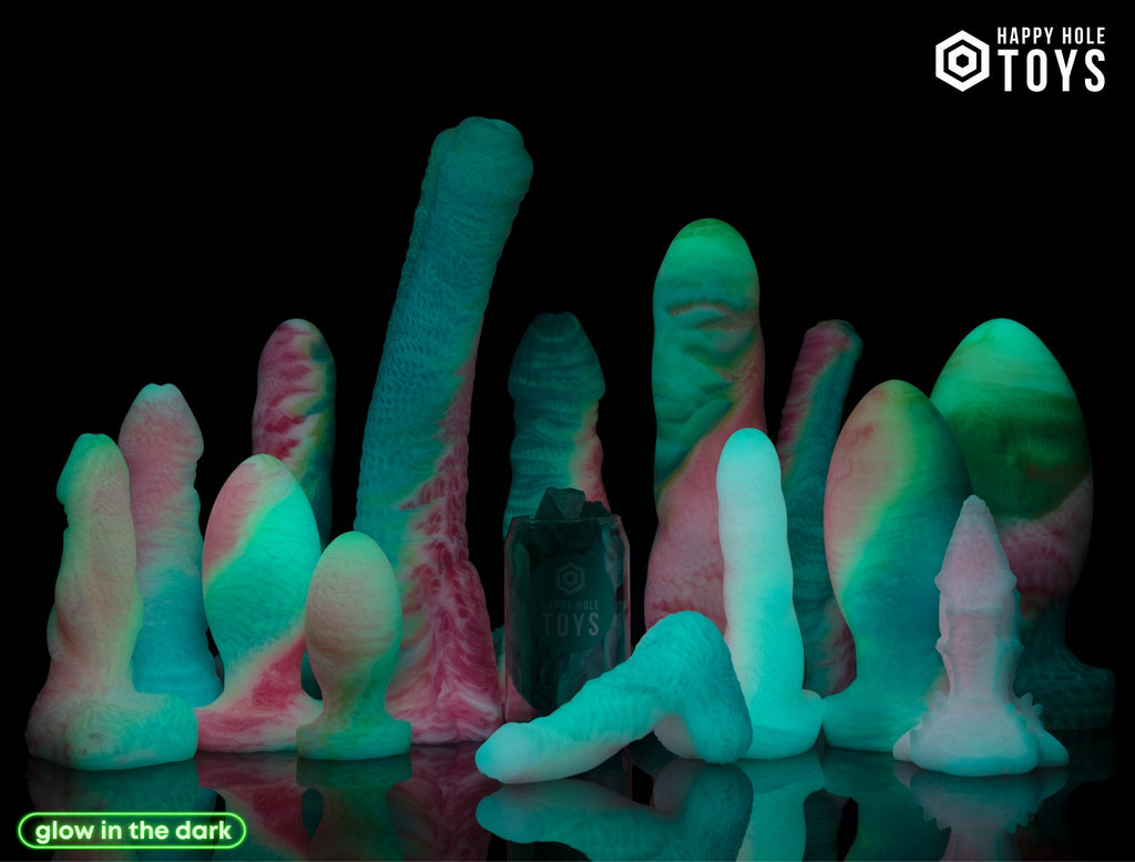 Please Note: Group photos showcase toys with comparable pour styles and colors, providing a glimpse of their UV-reactive appearance under backlight and/or how they glow in the dark. While illustrative, they may not depict the exact item listed.