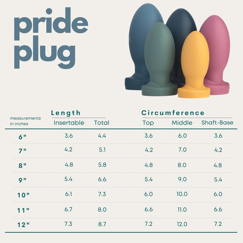 Pride Plug comes in seven sizes from 6 inch to 12 inch max circumference. Click for a size chart and text-reader friendly size information or visit Pride Plug's page for this and more!