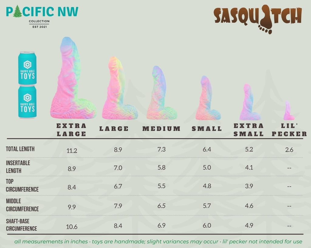 Sasquatch comes in five sizes from XSmall to XLarge. Click for a size chart and text-reader friendly size information or visit Sasquatch’s page for this and more!